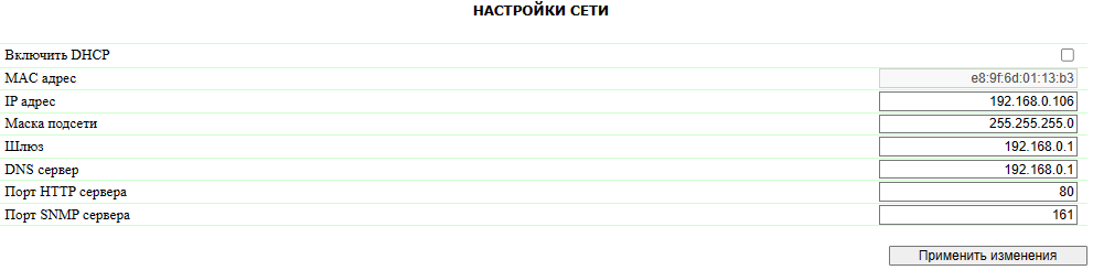 Включить DHCP – по умолчанию чек-бокс отключен. При включении чек-бокса устройство получит свободный IP адрес согласно настроек DHCP сети, к которой подключено устройство, после чего к редактированию будут доступны только поля для настройки портов HTTP и SNMP серверов.