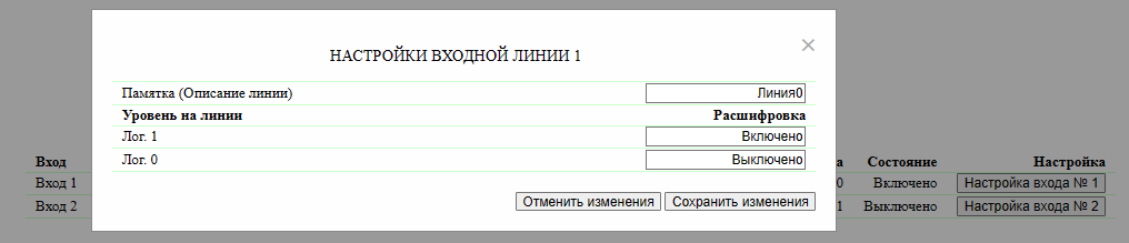 При нажатии на кнопку «Настроить» появляется диалог настройки для соответствующего входа. Здесь можно указать расшифровку цифровых значений текущего уровня линии входа, и памятку линии.