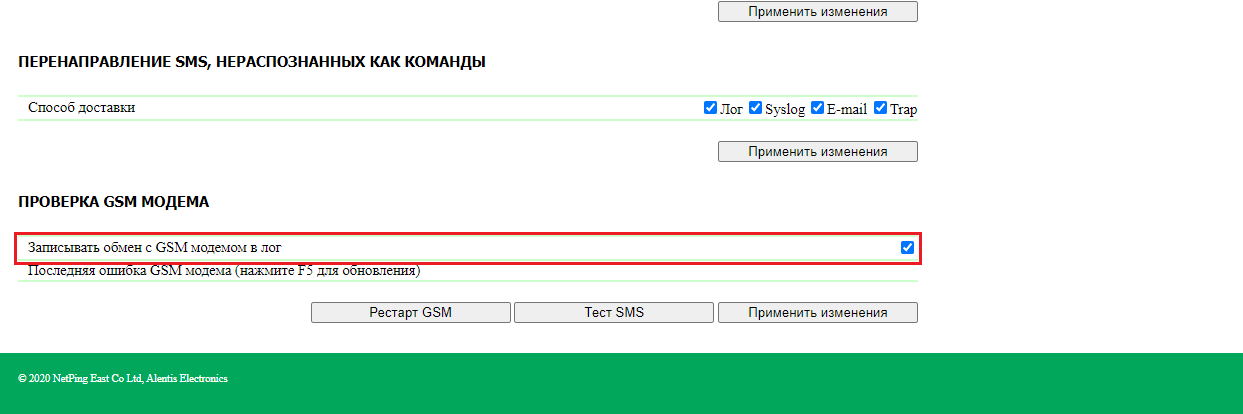 Расширенный лог для GSM-модема включается на странице «SMS» веб-интерфейса модуля: