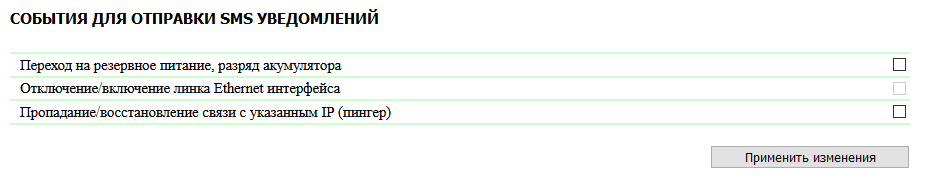Переход на резервное питание, разряд аккумулятора — при переходе модуля на резервное питание произойдет отправка SMS-уведомления на телефонные номера, прописанные в разделе «Настройки GSM» на странице «SMS» веб-интерфейса устройства;