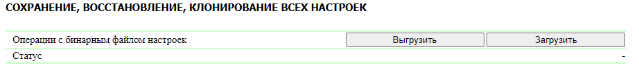 Для сохранения резервной копии настроенной конфигурации модуля специального ПО в бинарный файл необходимо зайти на страницу «НАСТРОЙКИ» веб-интерфейса устройства. В разделе «Сохранение, восстановление, клонирование всех настроек» нажать кнопку «Выгрузить»: