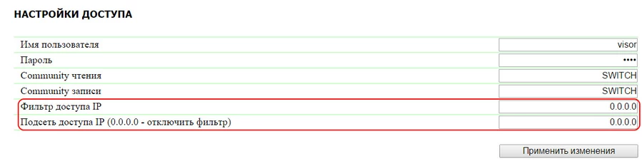 Фильтр доступа IP — поле, определяющее IP-адрес или подсеть, с которой разрешены конфигурирование и просмотр параметров специального ПО по протоколам HTTP, SNMP. К адресу, указанному в поле «Фильтр доступа IP», применяется маска подсети, заданная в поле «Подсеть доступа IP». В результате получается подсеть, из которой разрешено управление специальным ПО. Для того чтобы разрешить доступ для одного IP-адреса, необходимо указать маску 255.255.255.255 в поле «Подсеть доступа IP». По умолчанию: 0.0.0.0.