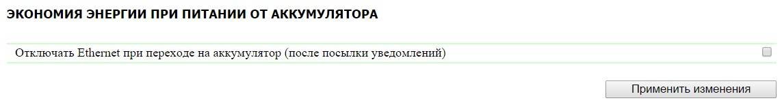 В разделе «Экономия энергии при питании от аккумулятора» можно отключить работу Ethernet-портов, если модуль специального ПО работает от резервного источника питания (встроенного аккумулятора). Если этот чекбокс установлен, то Ethernet-порты будут автоматически отключаться при переходе модуля специального ПО на резервный источник питания. И наоборот, Ethernet-порты модуля специального ПО будут автоматически включаться при переходе на основной источник питания.