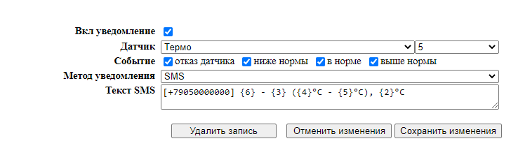 Текст SMS — произвольный текст для SMS-уведомления. В начале текста настраиваемого SMS-уведомления можно задать до четырех адресатов, указав их номера телефонов в квадратных скобках через запятую. Номера указываются в формате «Код_страныКод_оператораНомер_абонента». Между закрывающей квадратной скобкой и текстом сообщения должен быть пробел. Если не указывать адресатов, то есть в начале текста отсутствуют квадратные скобки, SMS отправится на номера, заданные в настройках на странице «SMS» веб-интерфейса устройства.