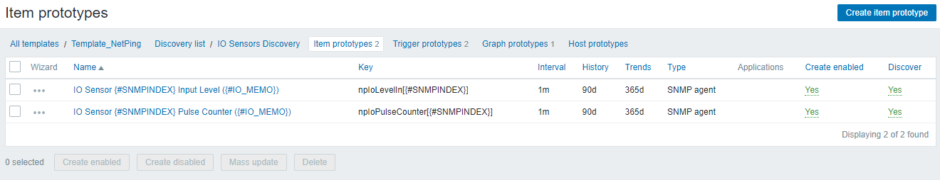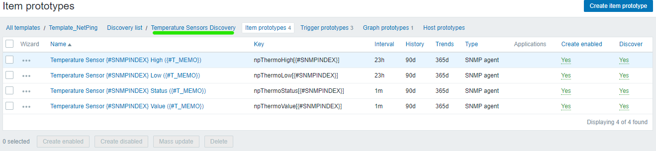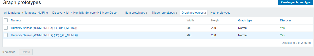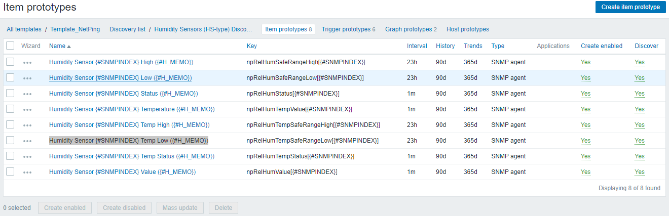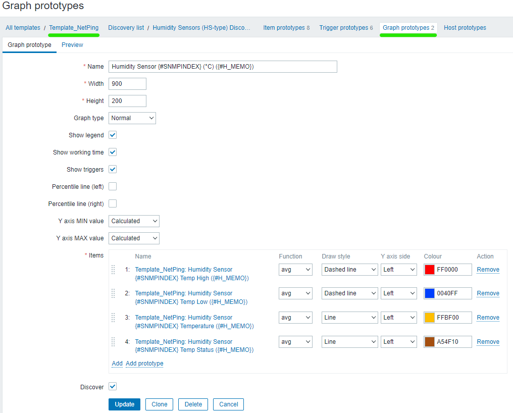 Настройка мониторинга датчика влажности (Humidity Sensor) доступна во вкладке Discovery rule/item prototypes: