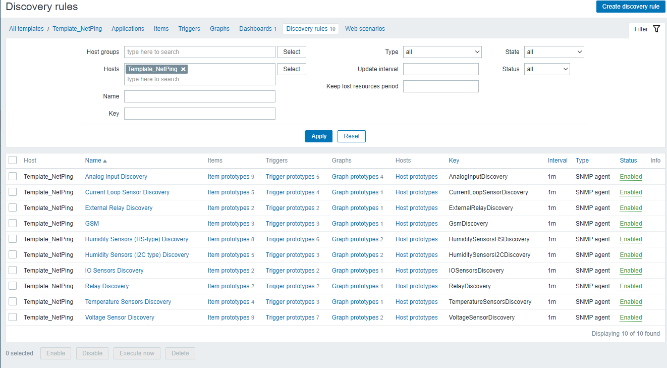 Мониторинг датчиков дыма, GSM модуля, Реле/Управляемые розетки, температуры и датчиков, подключаемых через IO интерфейс происходит в автоматическом режиме согласно настроенным правилам в меню Discovery rules:
