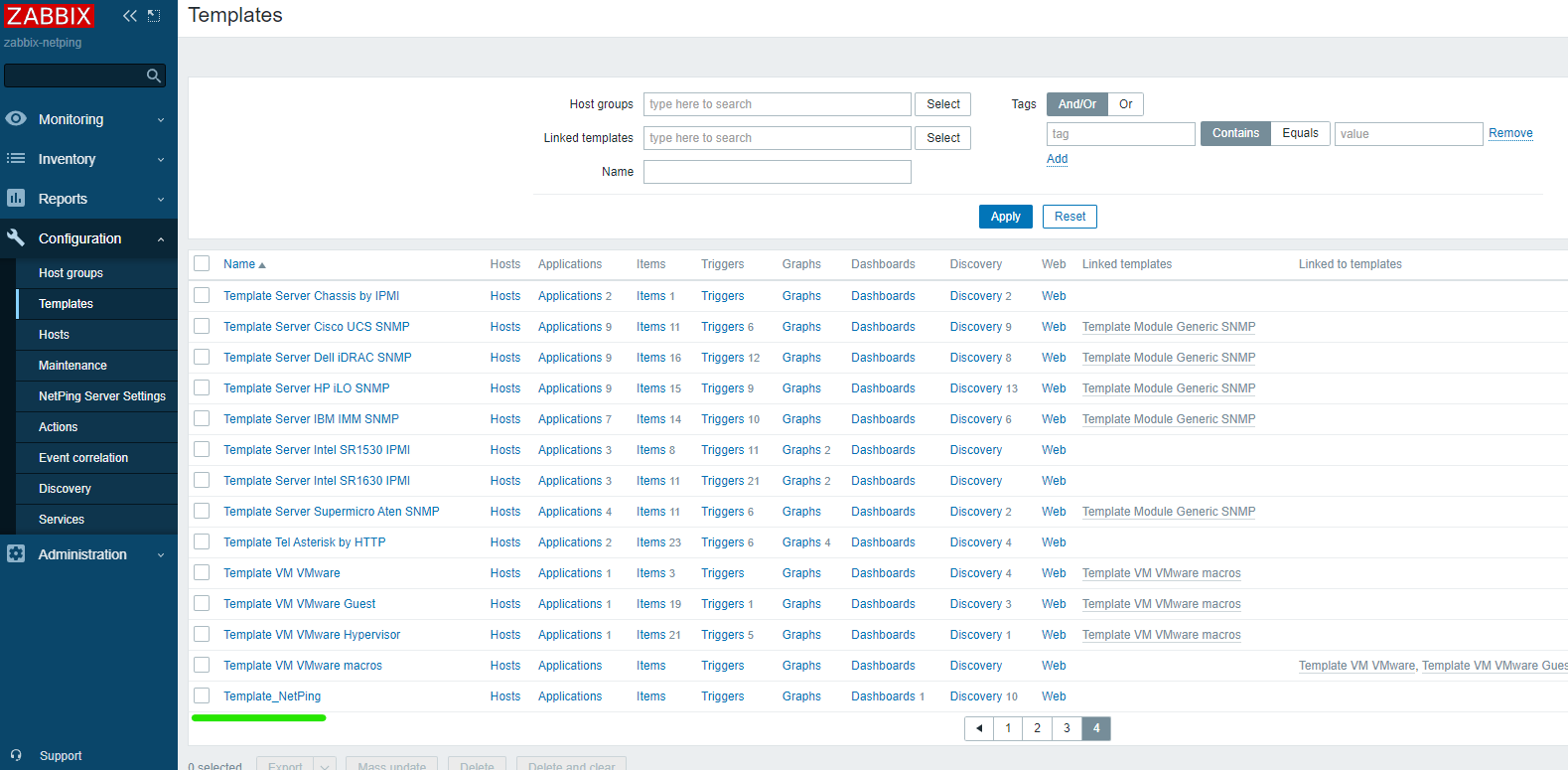 Редактирование производится в меню Configuration / Templates / Template_NetPing.