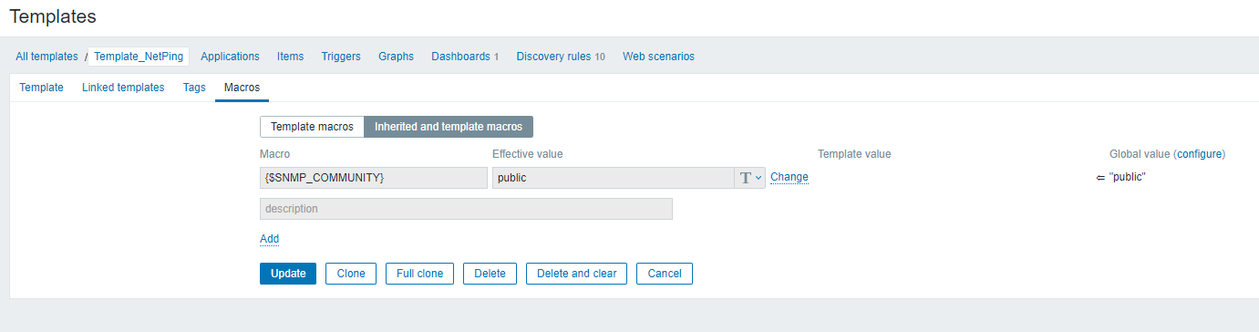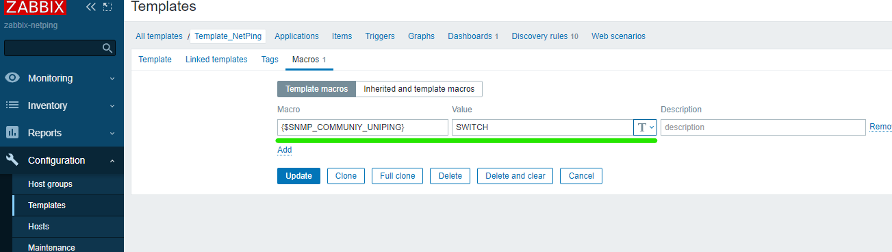2.После этого заходим в конфигурацию загруженного шаблона Configuration / Templates / Template_NetPing и открываем вкладку Macros.