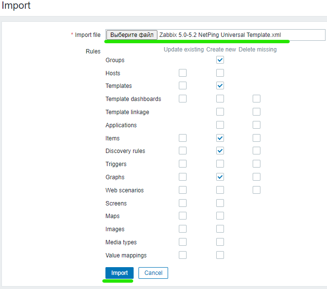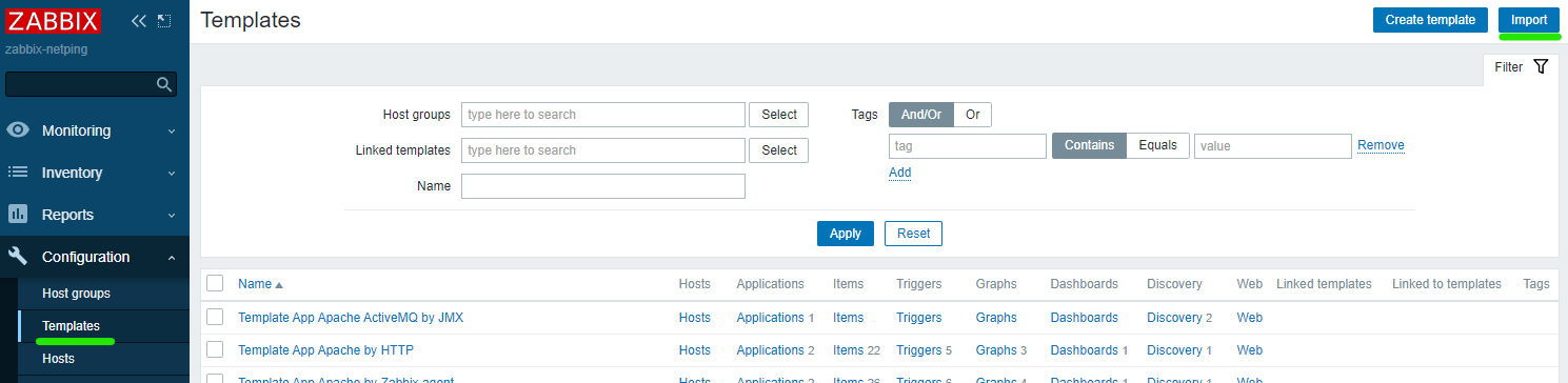 Импорт шаблона производится через меню Configuration / Templates / Import.