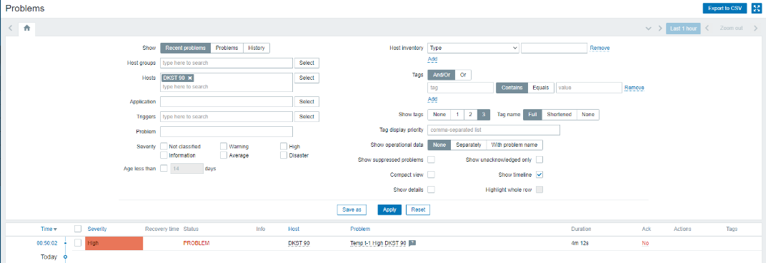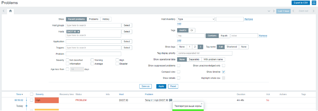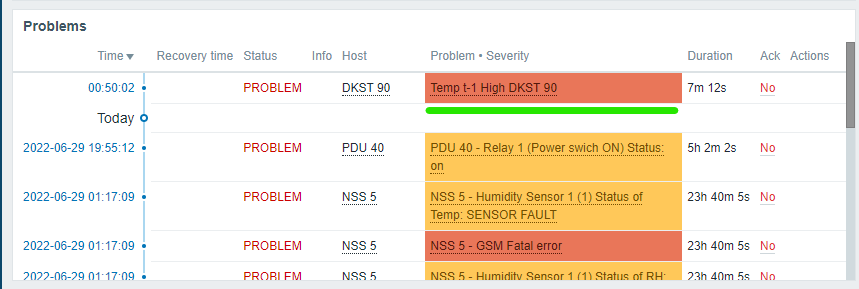 Для того, чтобы триггер с проблемой отображался на окне оператора (Dashboard) необходимо добавить виджет Problems на рабочей зоне. После чего мы сможем наблюдать проблемы и текущее их состояние