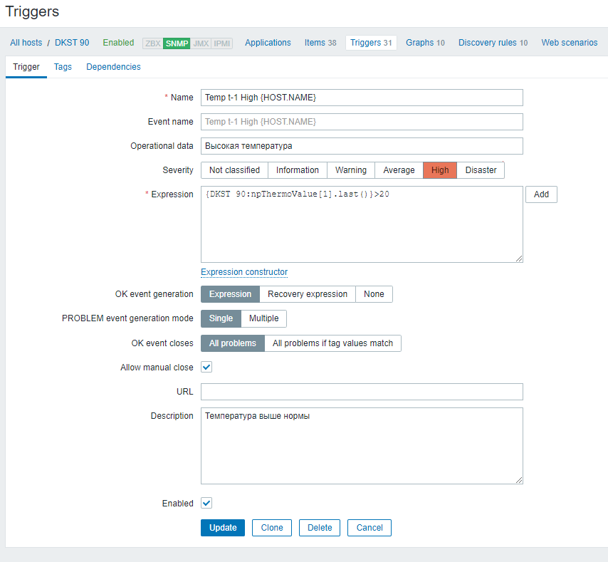 Allow manual close | Выберите, чтобы разрешить закрывать вручную события о проблемах сформированные этим триггером. Закрытие вручную возможно при подтверждении событий о проблемах. |
