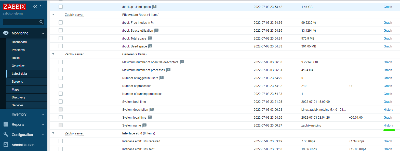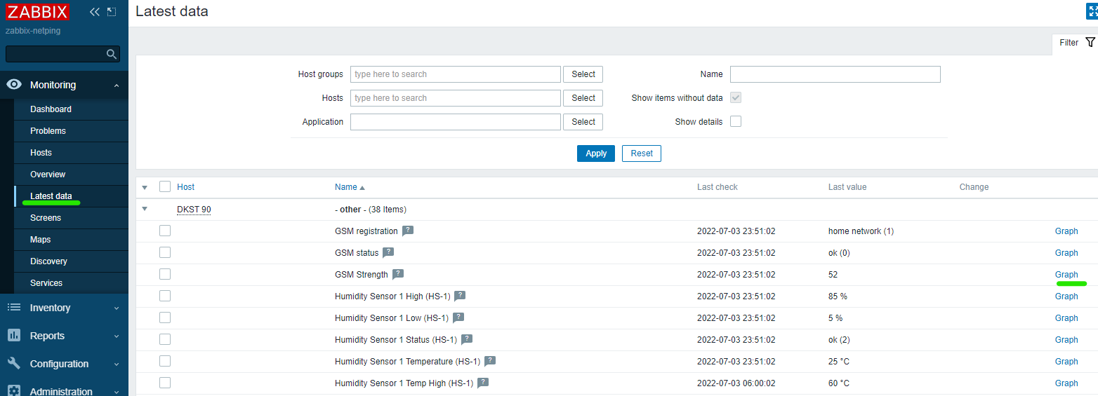 Перейдите в Мониторинг/Monitoring → Последние данные/Latest data