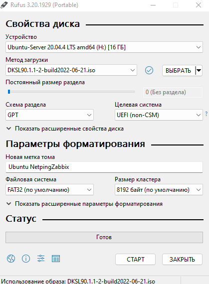 После удачной переустановки системы, когда у Вас есть доступ к web интерфейсу Zabbix и устройство корректно прогружает консоль, необходимо произвести установку системы с флешки, как это делается в инструкции. При создании образа системы необходимо использовать Rufus и выбирать схему разделов диска GPT