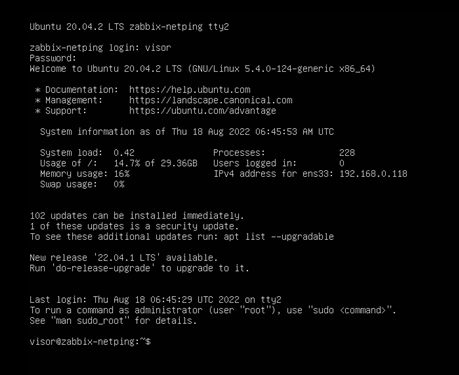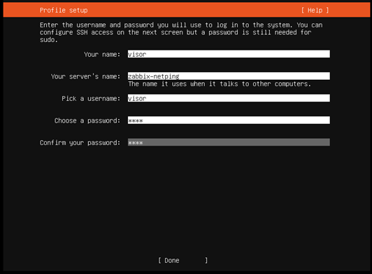 вводим имя и имя пользователя - «visor», имя сервера - «zabbix-netping», и пароль с подтверждением - «ping»;