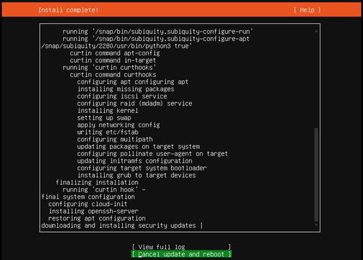 когда в левом верхнем углу появится надпись «install complete», выбираем пункт «cancel update and reboot»;