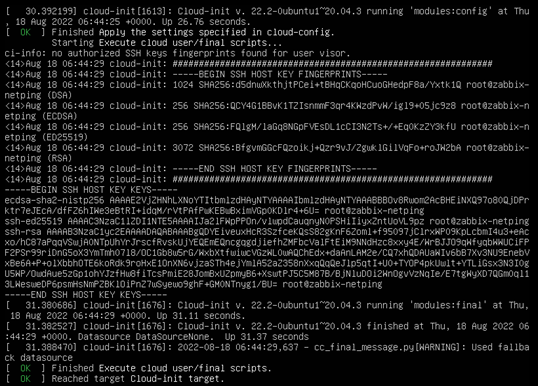 после логина можно увидеть информацию для удаленного входа в систему (192.168.0.118 порт SSH 22, Ваш адрес может быть отличен). Дожидаемся, пока произойдет полная установка системы.