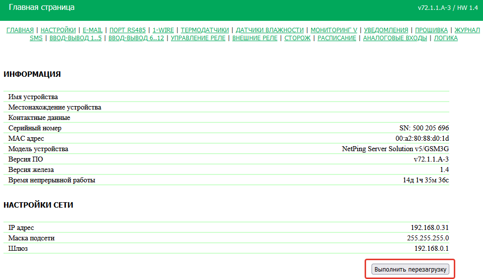 На главной странице устройства, в нижней части интерфейса кнопка «Выполнить перезагрузку»: