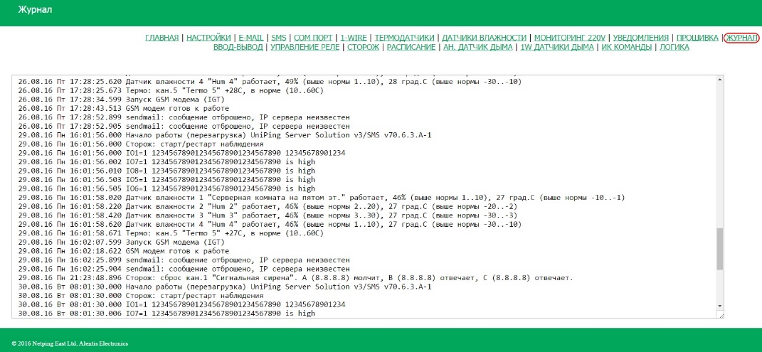 Страница «ЖУРНАЛ» web-интерфейса отображает работу устройства. В журнале в хронологическом порядке фиксируются события устройства. Все сообщения журнала дублируются по протоколу SYSLOG, если в настройках устройства задан IP-адрес SYSLOG-сервера.