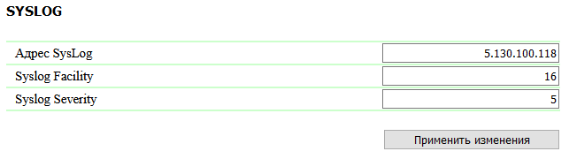 Адрес SysLog — IP-адрес SYSLOG-сервера; журнал устройства будет полностью дублироваться на SYSLOG-сервере;
