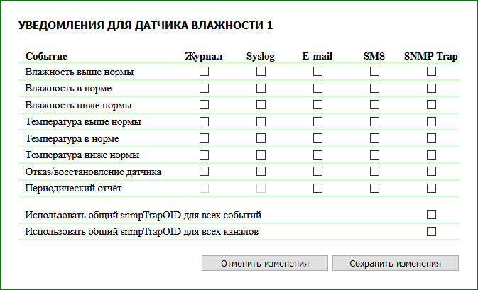 Чек-боксами «Использовать общий snmpTrapOID для всех событий» и «Использовать общий snmpTrapOID для всех каналов» можно направить все события от всех датчиков влажности единственным snmpTrapOID-сообщением либо развести события и номера датчиков влажности по разным snmpTrapOID-сообщениям, вплоть до совершенно индивидуальных. Это позволяет получать индивидуальные SNMP Trap-сообщения для обработки их в системах мониторинга, например, отсырение датчика влажности 3 или датчик влажности 2 в норме. При отказе датчика влажности приходят два SNMP Trap-сообщения: один по влажности, другой по температуре.