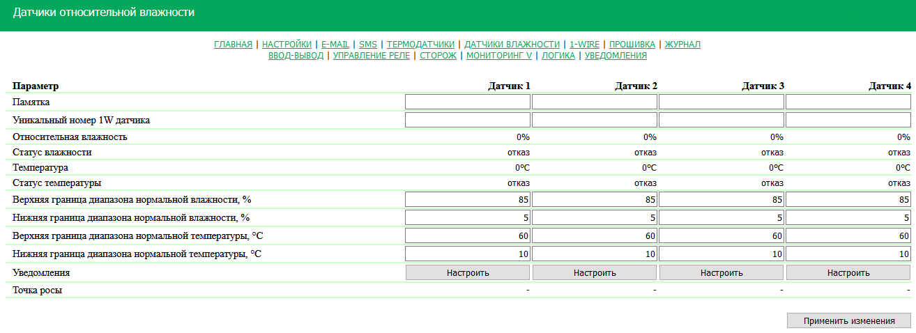 Для взаимодействия с датчиком через Web-интерфейс, нужно перейти на страницу «ДАТЧИКИ ВЛАЖНОСТИ» веб-интерфейса устройства: