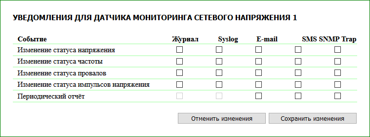 Изменение статуса провалов — отправка уведомлений при изменении статуса провалов напряжения. По умолчанию: чекбокс не установлен.