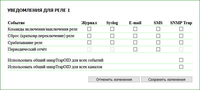 Чекбоксами «Использовать общий snmpTrapOID для всех событий» и «Использовать общий snmpTrapOID для всех каналов» можно направить все события от всех реле единственным snmpTrapOID-сообщением либо развести события и номера реле по разным snmpTrapOID-сообщениям, вплоть до совершенно индивидуальных.