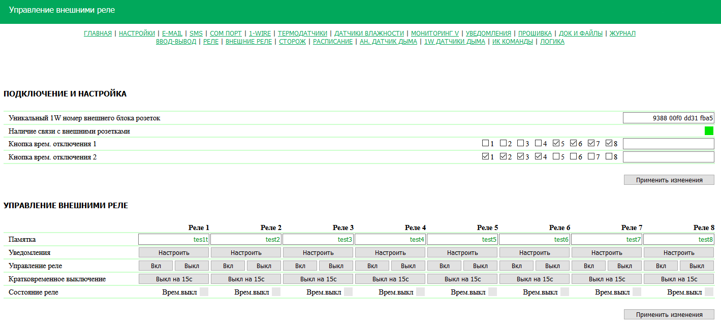 Для взаимодействия с датчиком через web-интерфейс, нужно перейти на страницу «ВНЕШНИЕ РЕЛЕ» web-интерфейса устройства: