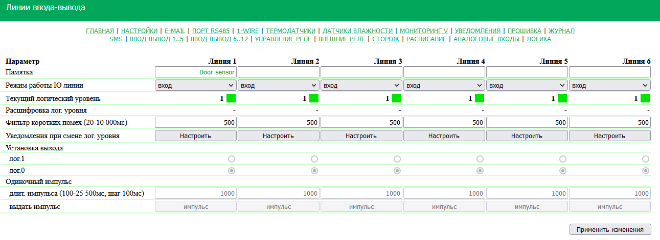Однократный импульс — при нажатии на кнопку «импульс» IO-линия, работающая как «выход», будет инвертирована на заданное время. Длительность импульса задается в поле «длит. импульса (100-25500мс, шаг 100мс)». Если линия настроена как «вход», кнопка выдачи импульса неактивна.