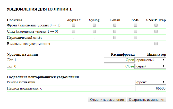 При нажатии на кнопку «Настроить» появляется меню настроек для отправки уведомлений следующих видов: Журнал, Syslog, Email, SMS (в устройствах со встроенным GSM-модемом), SNMP Trap, и здесь же можно указать расшифровку цифровых значений текущего уровня IO-линии, цветовую индикацию и другие настройки: