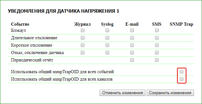 Использовать общий snmpTrapOID для всех событий и Использовать общий snmpTrapOID для всех каналов — отправка SNMP TRAP-сообщений для всех событий от всех датчиков напряжения 220 В единственным сообщением либо сообщений, позволяющих развести события и номера датчиков напряжения 220 В по разным сообщениям, вплоть до совершенно индивидуальных. Это позволяет получать индивидуальные SNMP Trap-сообщения для обработки их в системах мониторинга.
