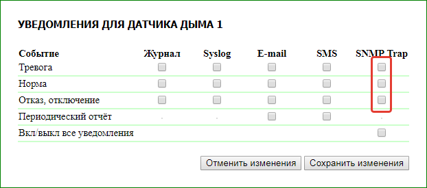 2. На страницах датчиков в индивидуальных для каждого датчика диалогах настройки уведомлений включить чекбоксы событий, отправляющих Trap'ы.