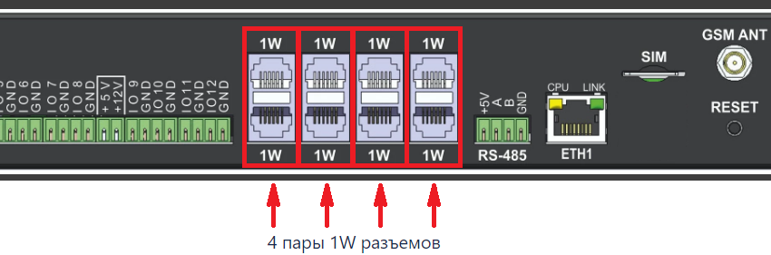 Датчики и аксессуары модельного ряда 1-Wire (термодатчик 1-Wire, (THS), 2м, датчик влажности 1-Wire, (HS), 2м, датчик качества электропитания, адаптер датчиков с аналоговым интерфейсом) включаются в разъёмы 1W вилками RJ12 с возможностью использования удлинителей и разветвителей. Максимальная длина шлейфа 1-Wire сети на одну пару разъемов (нижний + верхний) ограничена 50 метрами. Пары разъемов изолированы. Общую длину на пару разъемов можно увеличить при помощи удлинителя-разветвителя R912 до 300 метров.