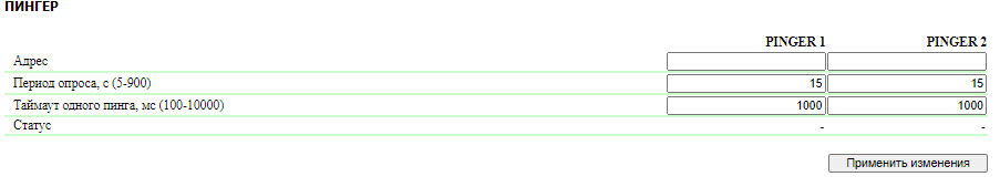 В разделе «Пингер» можно настроить проверку доступности по сети заданного IP-адреса/DNS-имени. Результат проверки (статус пингера) можно выбрать в качестве «входа» правила логики. Сконфигурировать можно не более двух пингеров — «PINGER 1», «PINGER 2». Типичное применение пингера — автоматическое включение питания резервного оборудования при отказе линии связи.