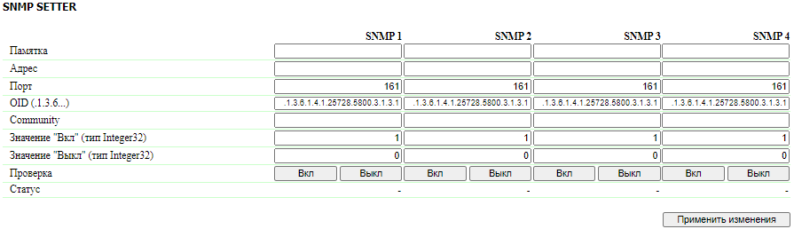 SNMP Setter 1..4 | Отправка SNMP SET-команд другим устройствам. | выключить | Записать в заданный OID значение, соответствующее «выкл» в настройках Setter'a. |