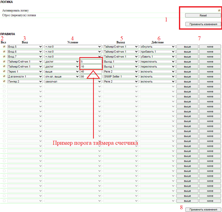 8. Применить изменения. Кнопка «Применить изменения» сохраняет запрограммированные правила логики в памяти устройства.