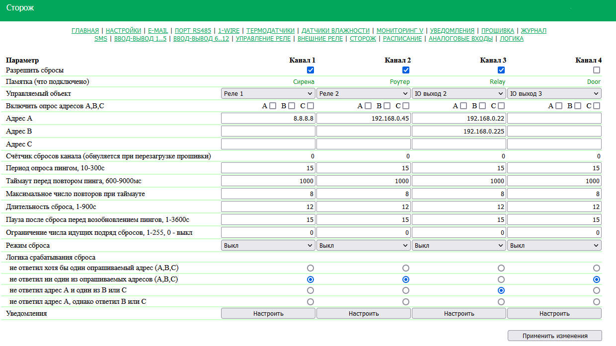 «Сторож» — это специальная сущность, которая постоянно, с заданной периодичностью, опрашиваются с помощью ping (ICMP Echo) указанные адреса. В случае отсутствия ответа – кратковременным импульсом (изменением состояния) реле или линии ввода-вывода (в режиме «выход») выполняется сброс питания подключенного устройства или иные действия.