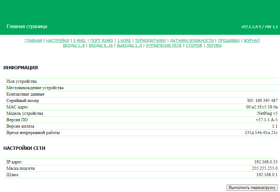 Контактные данные — контактные данные (как правило, email) администратора. Отображается на главной страниц. Может быть изменено на странице «НАСТРОЙКИ», доступно по SNMP.
