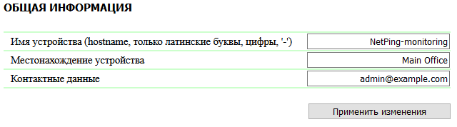 Имя устройства — имя устройства. Позволяет различать несколько однотипных устройств NetPing по имени. Имя отображается на главной странице и в заголовке web-интерфейса, в email уведомлении в поле «От:», в остальных уведомлениях и доступно по SNMP — sysName. По умолчанию: пустая строка.