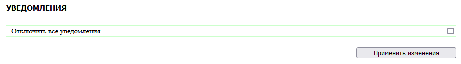 Отключить все типы уведомлений можно на странице «НАСТРОЙКА» web-интерфейса устройства. Для этого необходимо установить чек-бокс «Отключить все уведомления» и нажать кнопку «Применить изменения».