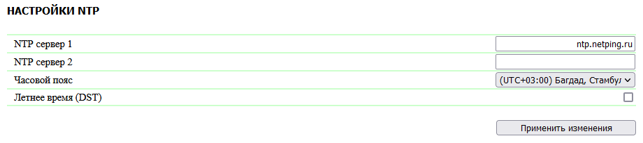 NTP-сервер 1 — настройка первого NTP-сервера. Допустимо указание как IP-адреса, так и доменного имени. По умолчанию: ntp.netping.ru.