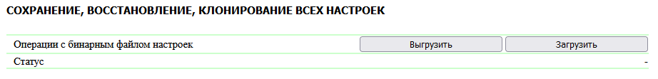 Для сохранения резервной копии настроенной конфигурации устройства в бинарный файл необходимо зайти на страницу «НАСТРОЙКИ» web-интерфейса устройства. В разделе «Сохранение, восстановление, клонирование всех настроек» нажать кнопку «Выгрузить»: