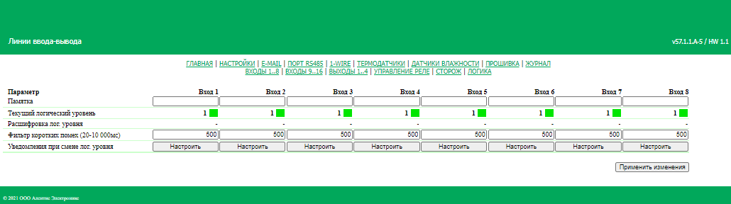 Настроить входы можно на странице «ВХОДЫ» веб-интерфейса устройства.
