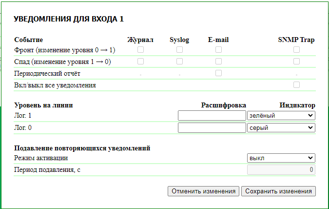 Спад (изменение уровня 1->0) — включение отправки уведомлений при смене статуса входа с «1» на «0». По умолчанию: флажок не установлен.
