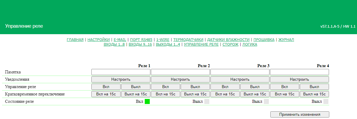 Для взаимодействия с каналами через Web-интерфейс, нужно перейти на страницу «УПРАВЛЕНИЕ РЕЛЕ» веб-интерфейса устройства: