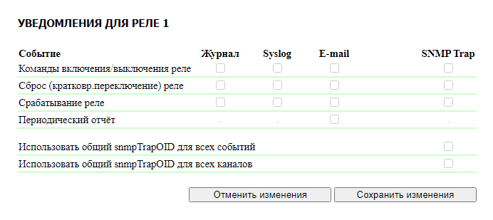 Чек-боксами «Использовать общий snmpTrapOID для всех событий» и «Использовать общий snmpTrapOID для всех каналов» можно направить все события от всех реле единственным snmpTrapOID-сообщением либо развести события и номера реле по разным snmpTrapOID-сообщениям, вплоть до совершенно индивидуальных.